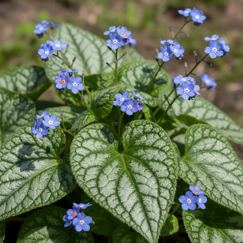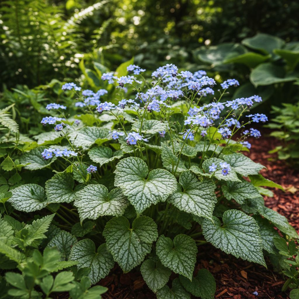 Теневыносливый многолетник с сердцевидными листьями и облаком мелких голубых цветков весной. Хорошо работает в нижнем ярусе композиций под деревьями и рядом с хостами, удерживая декоративность листвы до осени.