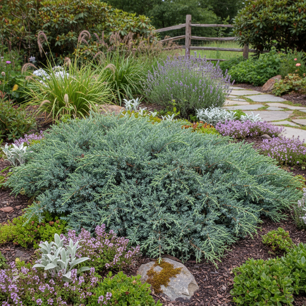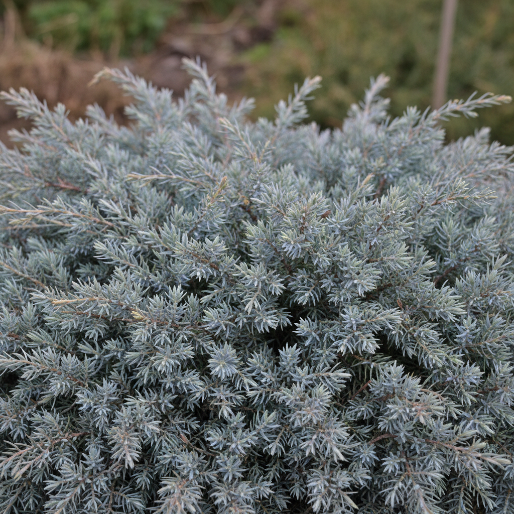 Низкий стелющийся хвойный кустарник с серебристо-голубой хвоей. Быстро закрывает почву плотным ковром, хорошо подавляет сорняки и подходит для солнечных склонов, рокариев и переднего плана миксбордеров.