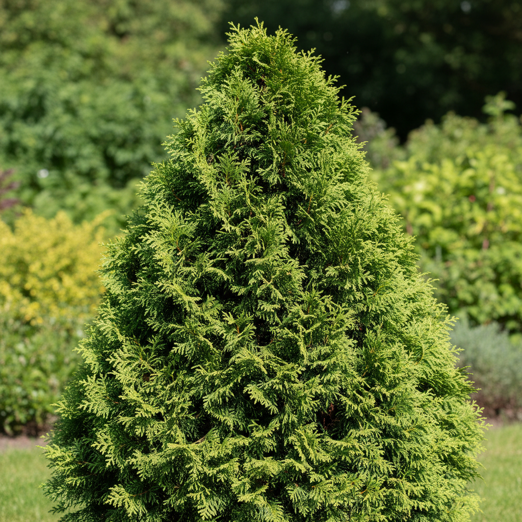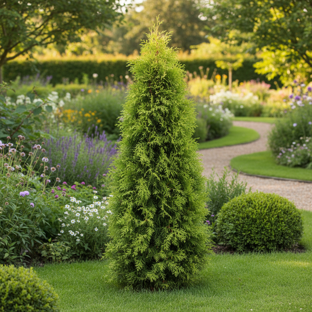 Быстрорастущая колонновидная хвойная порода с плотной ярко-зелёной хвоей. Формирует ровный вертикальный объём без частой стрижки — популярный выбор для живой изгороди, фона клумбы и структурных акцентов в саду. Хорошо переносит стрижку и формирование.